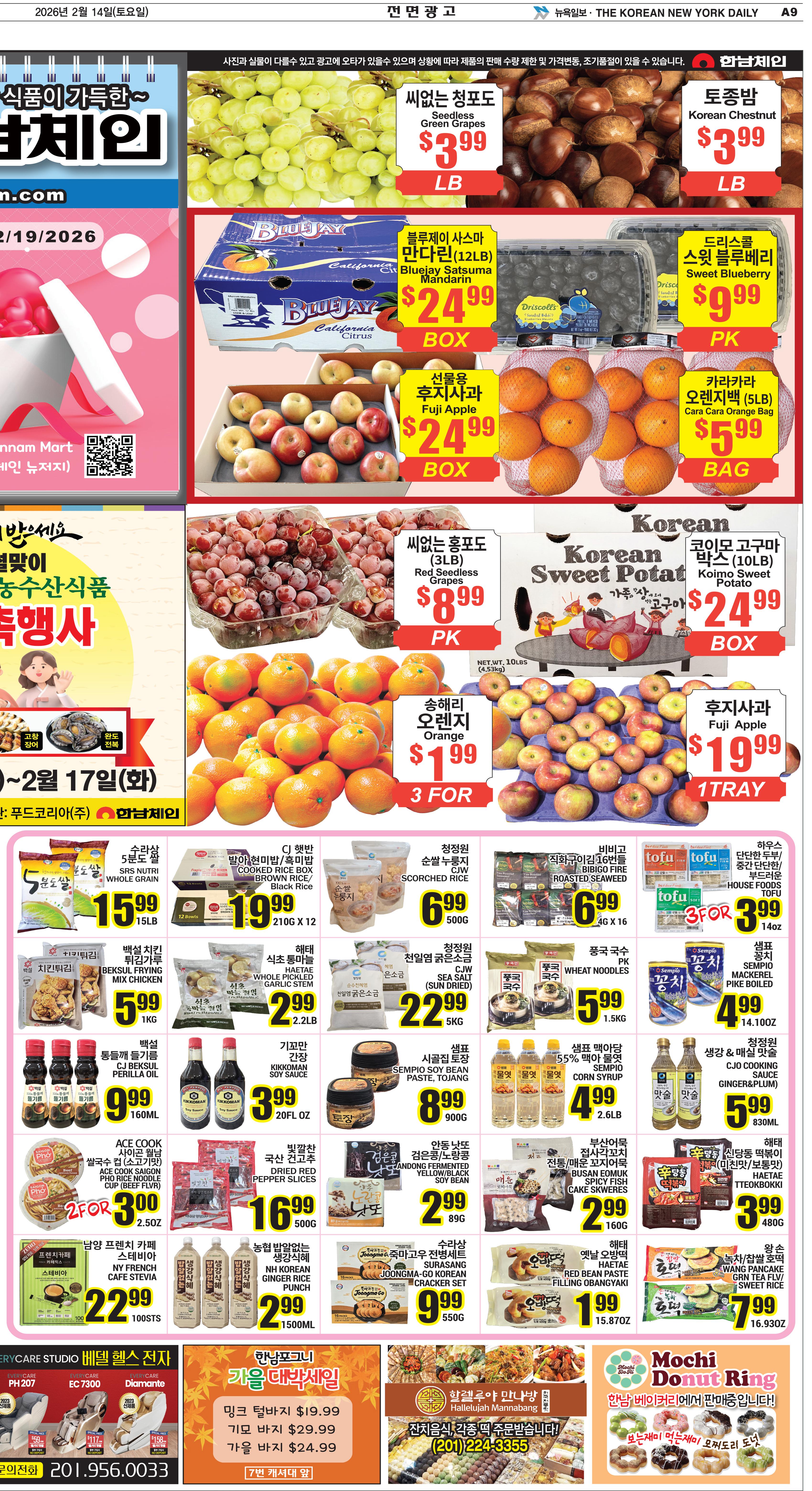 전까지 판촉행사를 진행한다. 6일부터 한남체인에서 진행하 고 있는 이번 설맞이 특별 이벤트 행사는 모시송편, 여수서대, 완도 미역 및 다양한 고급 젓갈 반찬 등 전라남도 향토의 맛을 보여주 는 것은 물론 완도전복, 고창풍천 장어, 간장게장 등 한국 직송 우수 한 수산물을 선보이고 있어 많은 호응을 얻고 있다. 이번 행사 주관사인 Korepia 대표는“설날을 앞두고 이번 금요 일부터 고창장어, 완도 전복, 간장 게장 등 신선한 제품이 많이 구비 되어 있다. 전라남도의 고향의 맛 과 다양하고 우수한 전라남도의 제품을 추가로 홍보하며 일부제 품은 할인행사를 병행한다”고 밝