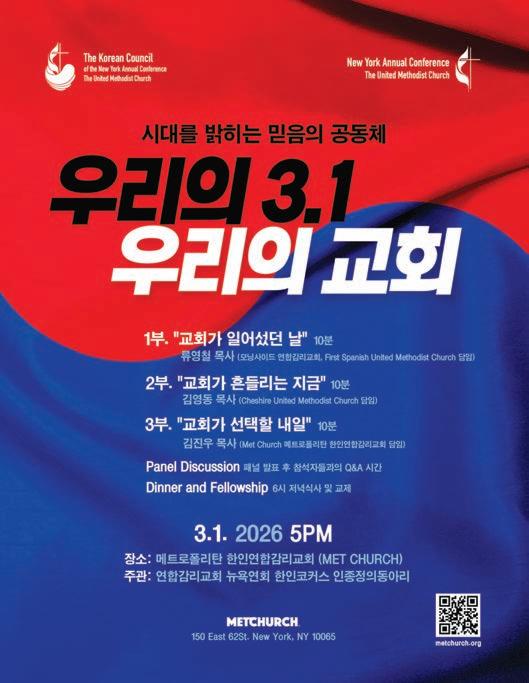 순진함만이 아닌 현실적인 문제로 마주하기를 소망한다”라고 덧붙 였다. 목회학 박사인 김영동 목사 는 Cheshire 연합감리교회를 담임 하고 있다. 세 번째 발표자 김진우 목사는 “교회가 선택할 내일”이란 주제를 발표한다. 김 목사는 기미년 정신 을 통해“정한 마음과 정직한 영으 로 시대를 밝히는 교회”의 길을 찾 자고 했다. 그는 시편 51편 100-11 절을 기억했다.“하나님이여 내 속 에 정한 마음을 창조하시고, 내 안 에 정직한