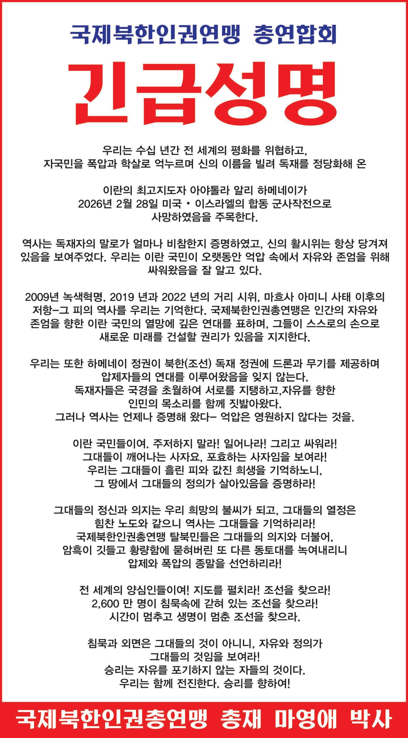 국의 강경 대응이 북한 등 다른 핵 개발 국가에도 경고 메시지가 될 것이라는 의미로 풀이된다. 북한은 지난 1일 외무성 대변 인 담화를 통해 미국과 이스라엘 의 대이란 군사작전에 대해“불법 무도한 침략행위이며 가장 추악한 형태의 주권침해”라고 규탄했다.