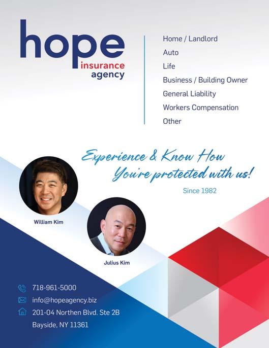 희망보험 since 1982 InsuranceProducersin NY NJ, CT. 개인 사업체 보험상담·설 계 기존계약서검토 신규가입; 생명·건강·메디케어 상담 △ HopeAgencyInc