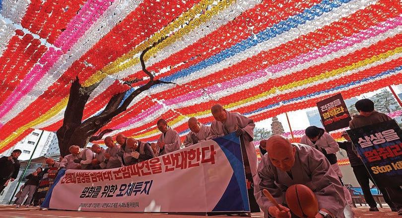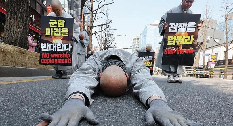 는 무모한 요구를 거절하라”고 촉 구했다. 18명의 스님과 제자들은 조계사 마당에서 이마와 두 팔꿈 치, 두 무릎 등 신체 다섯 부위가 땅에 닿도록 온몸을 엎드리는 오 체투지를 했다. 양 옆의 제자들도 “전쟁을 멈춰라”,“살생을 멈춰 라”, 군함 파견을 반대한다”는 피 켓을 들고 함께 걸었다. 정의당 권영국 대표도 행진 대 열에 합류해 함께 오체투지를 했 다. 권 대표는 오체투지를 마치고 “불의한 침략 전쟁에 대한민국이 동참해 젊은이들이 동조자가 되지 않도록 트럼프의 요구를 거부해야 한다”고 말했다. 진보 성향의 민중민주당도 오 전 청와대 분수대 앞에서 기자회