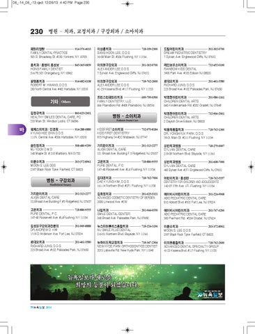 김대경치과 ------------------------------ 718-762-7006 어린이치과 / 홍성란 ------------------- 718-762-5557 DAE KYuNG KIM, D.D.S. DENTISTRY FOR CHILDREN AND ADOLESCENTS 161-14 Northern Blvd. #2Fl. Flushing, NY 11358 142-07 37th Ave. 1Fl. Flushing, NY 11354 가지런이치과 --------------------------- 201-313-2277 김희정치과 ------------------------------ 201-625-5321 에이비시어린이치과 ------------------ 201-224-9968 ALIGN DENTAL CARE ADVANCED COSMETIC DENTISTRY OF BERGEN ABC PEDIATRIC DENTAL CARE 321Broad Ave.Building F.#5 Ridgefield, NJ 07657 2000 Linwood Ave. #2W 810 Abbott Blvd. #303 Fort Lee, NJ 07024 고은치과 --------------------------------- 718-886-9555 나임치과 --------------------------------- 201-944-0550 에이비시어린이치과 ------------------ 201-767-0200 PuRE DENTAL, P.C. SMILE DENTAL CENTER ABC PEDIATRIC DENTAL CARE 147-48 Roosevelt Ave. #L6Flushing, NY 11354 268 Broad Ave. Palisades Park, NJ 07650 500 Piermont Rd. #204 Closter, NJ 07624 김성일구강외과전문의 --------------- 201-969-8888 뉴스마일플러스종합치과 ------------ 718-224-3196 DR.ANDREW D. KIM Nu SMILE PLuS DENTAL 1319-D Anderson Ave. Fort Lee, NJ 07024 216-01 Northern Blvd. Bayside, NY 11361 로데오치과 ------------------------------ 201-461-5580 RICHARD JuNG, D.D.S. 225 Broad Ave. #102 Palisades Park, NJ 07650
