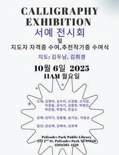 2024년- 강석기, 김영희, 박영진, 박은림, 박형식, 전길수 -삼체상: 김덕기, 김용철 송기 남, 이일순 -입선자: 강순애, 강혜숙 김희 재 △일시:10월 6일(월) 오전 11시 △장소: 팰리세이즈파크 도서 관 △문의: 팰팍도서관 (201)5854150 △ 문의 : Elynn Park –Kim