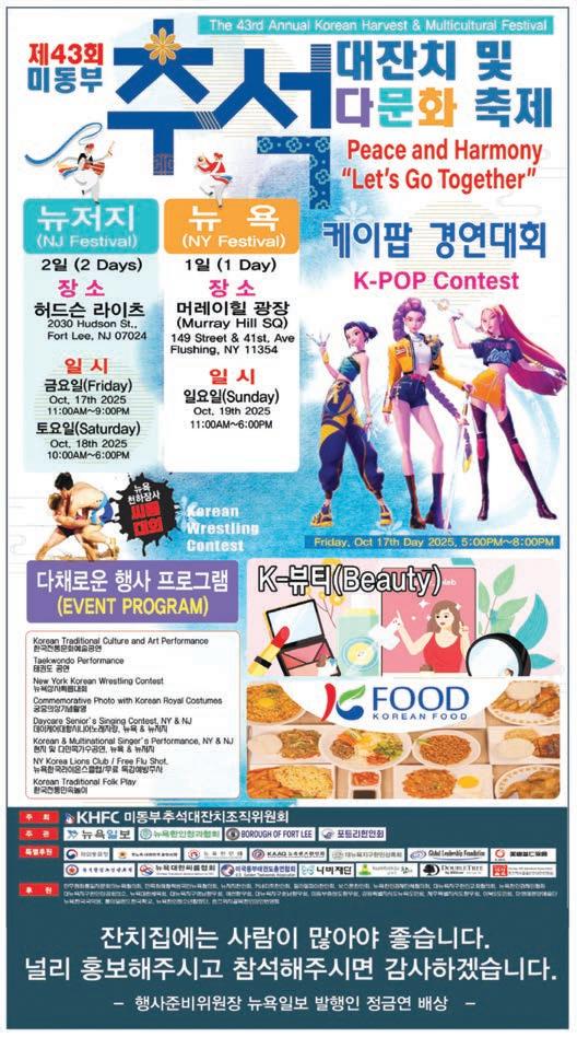 Hudson St., Fort Lee, NJ 07024) ์์, โฒ19์ผ(์ผ) ํ๋ฌ์ฑ ๋จน์๊ณจ๋ชฉ ๋จธ๋ ์ดํ ๊ด์ฅ(Murray Hill SQ, 148 SAt., + 41 Ave. Flushing, NY 11354)์์ ํฅ๊ฒน๊ณ ์๋๋ฒ ์ ํ๊ฒ ์ด๋ฆฐ๋ค. ๋ฏธ๋๋ถ์ถ์๋์์น์กฐ์ง์์ํ (์์์ฅ ์ค์ ๋จ)๊ฐ ์ฃผ์ตํ๊ณ ๋ด์ ์ผ๋ณด(์ฌ์ฅ ์ ๊ธ์ฐ)์ ๋ด์ํ์ธ์ฒญ ๊ณผํํ(ํ์ฅ ์ค์ ๋จ)๊ฐ ์ฃผ๊ดํ๋ค. ์ด๋ ๋ด์์ฅ์ฌ์จ๋ฆ๋ํ, ํ๊ตญ์ ํต ๋ฌธํ์์ ๊ณต์ฐ, ํ๊ถ๋ ์๋ฒ, ํ๋ณต ๊ณผ ๊ถ์ค์์ ์ฒดํ๊ณผ ๊ธฐ๋ ์ดฌ์, ๋ด ์ยท๋ด์ ์ง ๋ฐ์ด์ผ์ด ๋ํญ ์๋์ด ๋ ธ๋์๋, Kํ ๊ฒฝ์ ๋ํ. ํ์ง ๋ฐ ๋ค๋ฏผ์กฑ ๊ฐ์ ๊ณต์ฐ, ํํํต์ผ