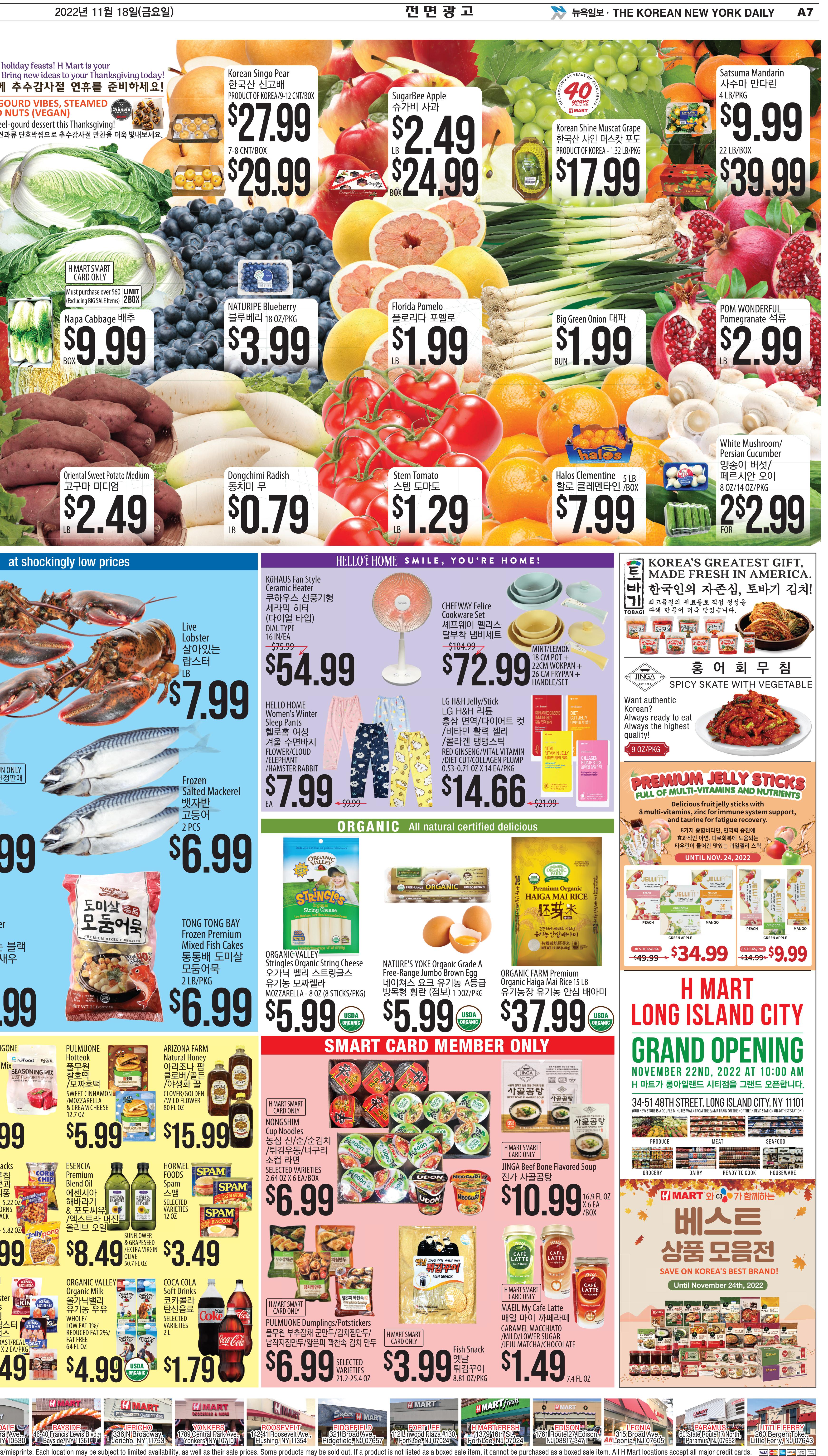 A12 FRIDAY, NOVEMBER 18, 2022 Micro ber Pad/ Q-59.0" × 78.7"/ Beige, Gray Pirate Pop Up Game Korean Red Ginseng Immune Jelly Sticks/ 14pcs × 15g Diet Cut Jelly Sticks/ 14pcs × 20g Collagen Plump Jelly Sticks/ 14pcs × 15g Vital Vitamin Jelly Sticks/ 14pcs × 15g Stainless Steel Bottle Opener/ Plastic Grip Plastic Fork Single/ 28cm, 30cm Divided/ 28cm, 30cm Reg. $129.99 Reg. $21.99 Reg. $8.99 Reg. $75.99 set KüHAUS Fan Style Ceramic Heater Brown, Navy, Mint, Pink HELLO Cutlery Set Service for 4/ Flower Deer Apron BT21 Baby Printed Essence Sheet Mask $ 2.99 Reg. $3.99 ea. ea. 양식기 4인 세트/ 꽃사슴 앞치마 KOTO Electric Bamboo Grill & Griddle Reg. $34.99 ea. Fork, Knife $ 22.99 Reg. $35.99 set $ 19.99 3.5L HELLO Laundry Drying Rack ea. $ 31.99 Reg. $42.99 $ 39.99 142 × ea. Reg. $62.99 Reg. $8.99 ea. $ 5.99 Reg. $4.99/ea. 르브아 극세사 차렵이불/ 배개커버/패드 $ 99.99 REVOIR Micro ber Series ea. ea. ea. Reg. $13.99 Reg. $69.99 $ 59.99 ea. Charcoal Mint, Ice Mint/ 3.4oz 400ml LG PERIOE Himalaya Pink Salt Toothpaste 엘지 페리오 히말라야 핑크솔트 치약 KOTO Premium Stainless Steel Shabushabu Pot ~ $ 19.99 Reg. $21.99/ea. LG Re:tune Jelly Launching Sale Buy 2 Get 1 free EYECANDY Brush 아이캔디 레인보우 브러쉬 Black, Pink $ 8.99 Reg. $12.99 ea. White, Dark Gray/ 3.5L KOTO Electric Non-stick Hot Pot $ 27.99 Reg. $44.99 ea. ea. $ 15.99 Reg. $23.99 Reg. $27.99 ea. Ginseng Blossom Shampoo $ 14.99 Reg. $19.99 KüHAUS Electric Thermo Pot 37.5 × 25cm Reg. $15.99 ea. $67.99 $ 54.99 2.5g x 4pairs Reg. $15.99 ea. $ 2.49 $3.49 L/24x39cm HELLO Co ee Tumbler Mug $14.99 헬로 커피 텀블러 머그 $ 8.99 ea. Teapot - 700ml, Teacup - 100ml × 4pcs/set × Black, White/ 500ml set $ 14.99 KOTO Stoneware Teapot Set HELLO HOME Plush Rabbit Slipper HELLO Clean Water Spin Mop + 2Mopping Pads $ 54.99 Mint, Lemon/ Pot, Wokpan, Frypan, Handle/set ~ 코멕스 김치통 모음 $ 8.49 Reg. $10.99 ea $ 24.99 Reg. $31.99 ea KOMAX Kimchi Container 5.2L, 8.3L, 11.5L, 14L, 16L CHEFWAY Felice Cookware Set Reg. $104.99 셰프웨이 펠리스 탈부착 냄비세트 $ 72.99 Family Board Game ea. $ 34.99 Reg. $45.99 Reg. $14.99 ea. $ 12.99 ea. $ 32.99 Reg. $5.99 $ 4.99 ea. 2ea for $ 6.00 16” Throwing Coconuts Micro ber Comforter/ Q-70.8" × 78.7"/ Beige, Gray ITEM NEW ITEM NEW SALE BIG Flower, Cloud, Squirrel, Elephant 헬로홈 여성 겨울 수면바지 ea. $ 7.99 Reg. $9.99 HELLO HOME Women's Winter Sleep Pants Assorted ea. H Mart Stores Only