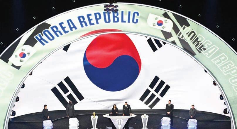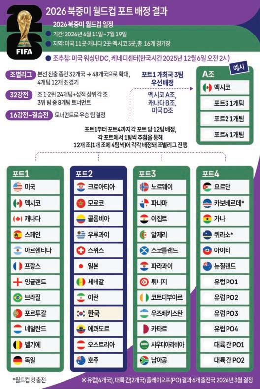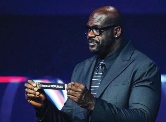 지(뉴욕 양키스), 미국프로농구 (NBA) 샤킬 오닐, 북미아이스하 키리그(NHL) 웨인 그레츠키, 미 국프로풋볼(NFL) 톰 브레이디 (이상 은퇴)가 무대에 올라 추첨 용 공을 뽑았다. 한국이 속한 포트2 공들이 담 긴 보울은 오닐이 맡았다. FIFA가 새로 제정한 FIFA 평 화상은 도널드 트럼프 미국 대통 령이 받았다. 잔니 인판티노 FIFA 회장은 행사 진행을 위해 무대에 오르자 마자 트럼프 대통령의 참석을 알 리고 FIFA 평화상 시상에 12분이 라는 긴 시간을 들이는 등 극진하 게 대접했다. ◇ 2026 FIFA 북중미 월드컵 조 추첨 결과(괄호는 FIFA 랭킹) ▲ A조 = 멕시코(15위) 남아프 리카공화국(61위) 한국(22위) 유 럽PO 패스D