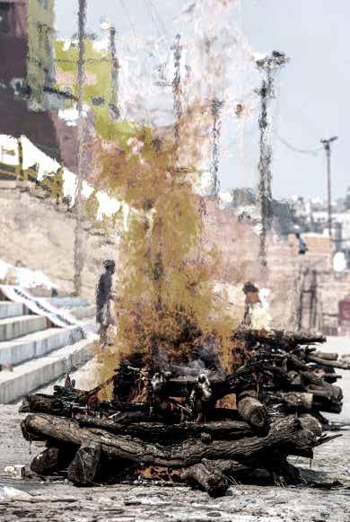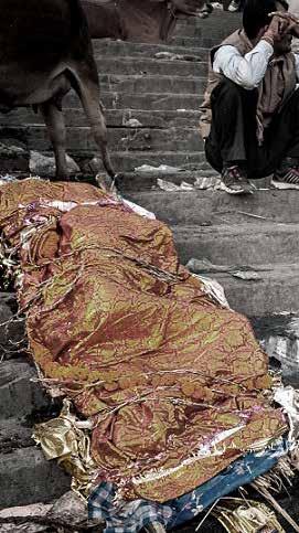 Orange represents the sun. The Sun is the indicator of Moksha in the hindu culture and hence it is often the choice of colour to dress the deceased in. Apart from the auspicious colour, the covering of the corpse serves a significant practical purpose. The first and naturally so, is to hide the uncanniness of death (2). As there are many who have passed outside of Varanasi, their bodies takes over a day to be transported(3) to the Manikarnika, given India’s hot and humid climate(6), the bodies would undergo severe rotting at an exponential rate, the cloth protects the living from these realities. In a similar chain of thought, the next reason is scent, as the body rots, it produces the stench and is beyond revolting, covering the body reduces the exposure of the natural elements, but also reduces the spreading of smell to the surroundings, this is often aided by covering the body with flowers and other auspicious vegetation. In all the cloth not only acts as a symbol of bliss, but as a barrier that protects the living from the realities of death.