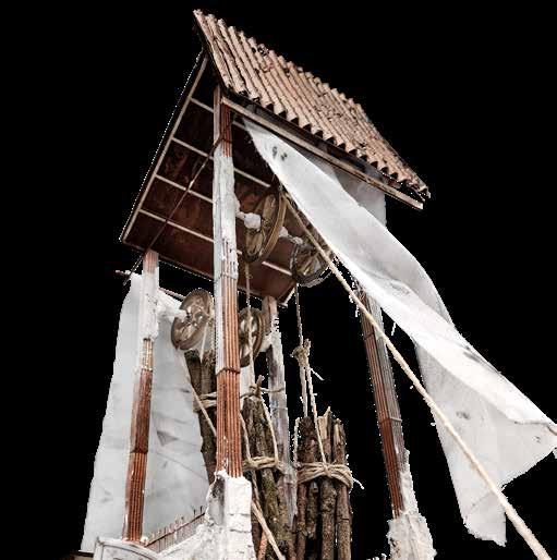 Covering the corpse takes place just before laying it over a bamboo stretcher for the grievers to shoulder down to the river. The structure size is hence determined by the anthropometry of the human body(2), and the standardization of the bamboo stretcher(4). The structure facilitates the process of wrapping, but the construction of the stretchers in a uniform manner(2). It takes advantage of the malleability of the orange cloth(3) and uses it as a facade treatment that also protects the identity of the Dom Workers through creating a semi-ambiguous working environment. Hoisted above the ground, the structure also respects the deceased by ensuring it does not touch the ground and can be immediately placed on the shoulders(5) of grievers once the wrapping is done. The potential lack of wood for burning anticipates long queues that could possibly take days in wait of the materials for burning. A storage facility is included below for bodies to be kept, ashes is also used as a drying agent to reduce humidity levels to slow the process of decay.