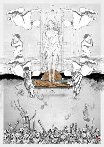 Proposal - Evolution Through Design ELDON NG YEW KEONG A0182451J ISSUE DESCRIPTION STAGE DATE ARCHITECTURAL DESIGN THESIS 2022/2023 TSUTO SAKMOTO STUDIO ASSEMBLAGE NATIONAL UNIVERSITY OF SINGAPORE (NUS) DEPARTMENT OF ARCHITECTURE (DOA) CALL: +65 91198143 DRAWING NUMBER DRAWING PROJECT ALL DIMENSIONS ARE MILLIMETERS UNLESS OTHERWISE STATED. PLEASE READ THIS IN CONJUNCTION WITH ALL OTHER THESE DETAILS SHOWN ARE INTENDED TO CONVEY ONLY THE DESIGN REQUIREMENTS WITH RESPECT TO PROFILES, DIMENSIONS, FINISHES GENERAL ARRANGEMENT OF COMPONENTS; & SHALL NOT CONSTRUED AS ABSOLUTE & ALL INCLUSIVE. NOTWITHSTANDING ANY OMISSION &/OR INADEQUACY THEREOF, THE CONTRACTOR SHALL BE RESPONSIBLE FOR THE DESIGN ENGINEERING, FABRICATION COMPLETE CONSTRUCTION OF THESE COMPONENTS INCLUDING ALL MEASURES NECESSARY TO GUARANTEE FULL COMPLIANCE TO THE DESIGN INTENT, SPECIFICATIONS, PERFORMANCE CRITERIA, WHERE APPLICABLE, TO ALL LOCAL CODES STANDARDS. OWNER OBJECTS ENTITIES MEANINGS [THE TALE OF THE DOM WORKER'S MOKSHA] CALL: +65 91198143 FOR TENDER ONLY TENDER DRAWING 10.04.2023 THE GREAT LIBERATOR PLAN & SECTION A-02-001 F C A E 2 D B 5 1 3 1 5 4 3 2 4 650 125 800 675 1100 650 600 650 600 500 500 500 500 500 150 150 800 1100 250 350 100 F C A E D B A 0.000 650 1,575 2,250 200 200 30 ~2000 ~2000 550 2200 200 200 1300 1000 1300 3600 ~2000MM (L) X ~30MM (D) BAMBOO POLE WIELDED BY DOM WORKER 550MM (D) IRON ROUNDED TEETH GEAR SYSTEM 50MM THICK CYLINDRICAL CATCH FOR BAMBOO 30MM (D) THK POLE CONCRETE FURNANCE IN SMOOTH FINISH HANDMADE BY DOM WORKERS CONCRETE PLINTH STEEL GATE MADE FROM EXISTING CREMATION PYRE 10MM THK STEEL RAIL (50MM DEPTH) SPACE ALLOCATED FOR PYRE & CORPSE SCALE 1:50 THE GREAT LIBERATOR PLAN SCALE 1:50 THE GREAT LIBERATOR SECTION A 1. 2. 3. The Great Liberator Model 1:10 Scale The Great Liberator Plan & Section 1:50 on A3 Interior shot of model featuring gear system that compacts wood during cremation process 1. 2. 3.