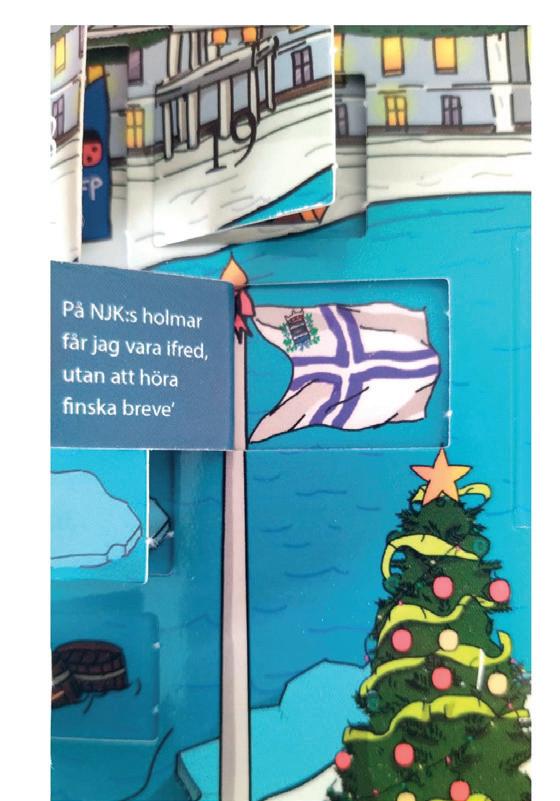När jag öppnar lucka ett i den roliga julkalendern med Blekholmen som motiv, som jag fått i gåva, får jag kaffet i vrångstrupen.