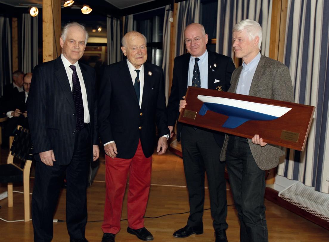 Förtjänsttecken tilldelades Christian Hortling, magnus vaenerberg och Patrik Hertsberg. Samtliga herrar har i många år jobbat för klubbens väl med olika projekt inom och utanför sina styrelseuppdrag. Heinz Ramm-Schmidt med sönerna Leif och michael överräckte en halvmodell av Tarantella II, som de låtit tillverka i Italien. Till kuriositeterna kring båtens historia kan nämnas att Heinz varit befälhavare i 22 år, Leif i 23 år. Med båten har de tagit hem 112 pris och bl.a. deltagit 13 gånger i Gotland runt. Kommodor Tallberg tackar ödmjukt för halvmodellen som ska hängas upp i Tarantella-kabinettet på Blekholmen. Han undrar ifall det ändå inte är för tidigt att sluta med kappseglandet. Leif säger med glimten i ögat att pappa Heinz slutade fem gånger och det här är första gången han ”slutar”.