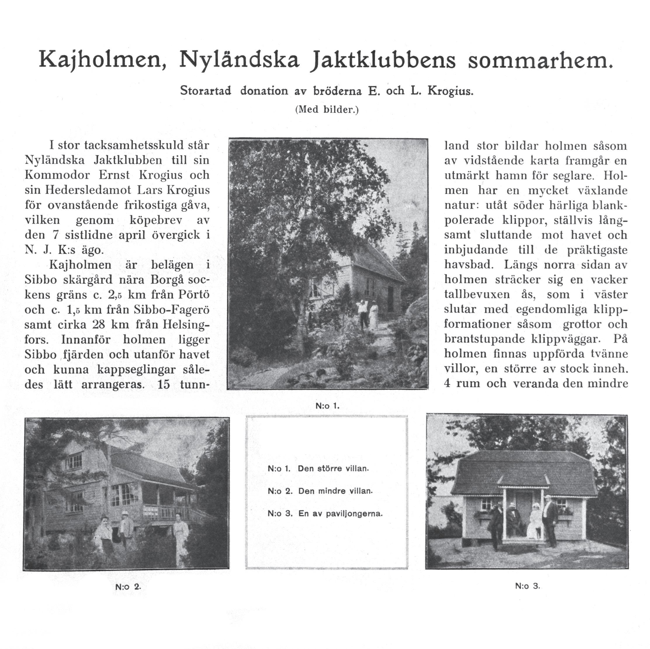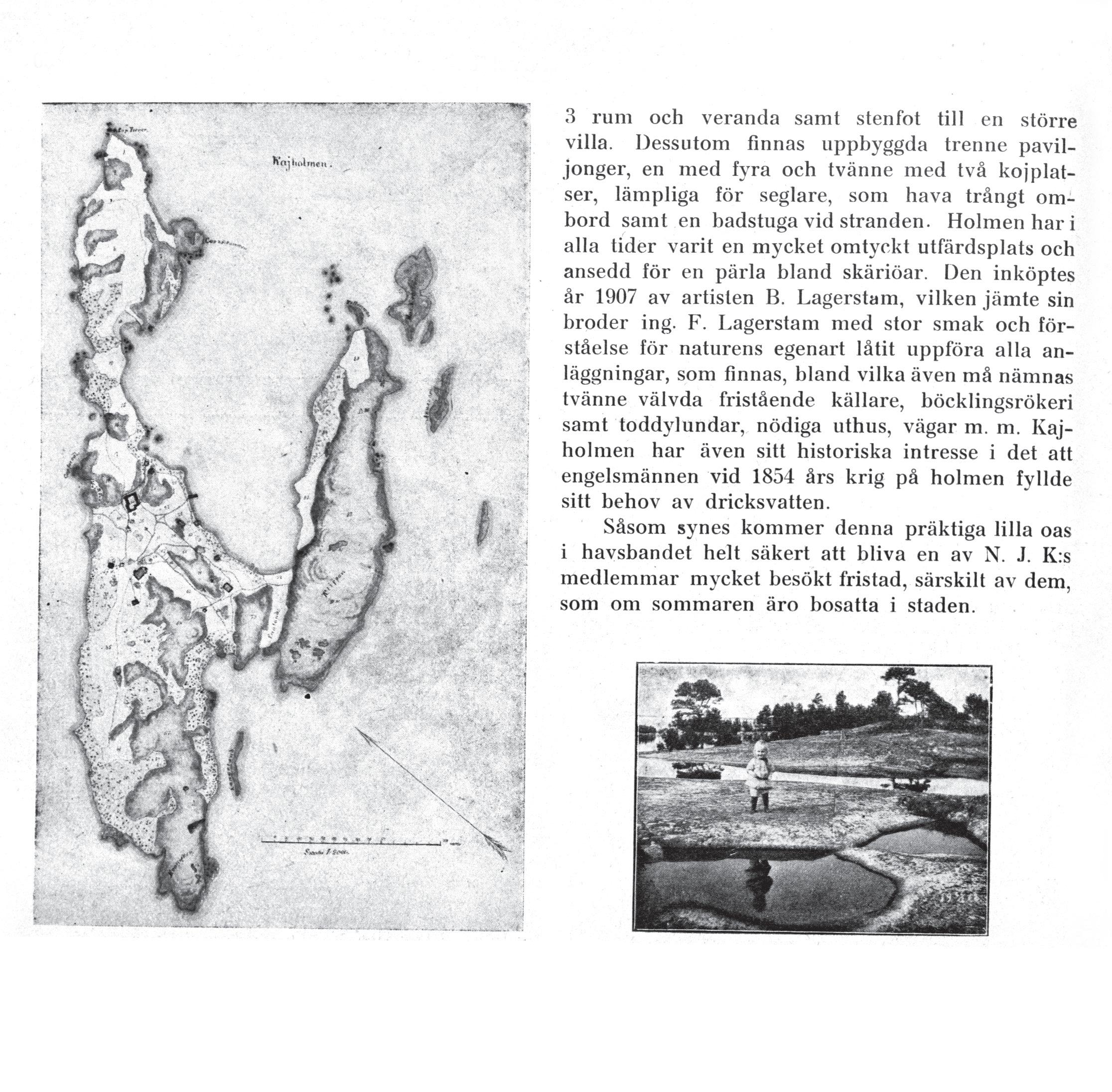 I Frisk Bris från april 1919 presenteras den generösa donationen som vi firar i år. En beskrivning av holmen i detalj och vi känner igen oss. De bekanta villorna har under årens lopp fått nya namn; Strandvillan och Vaktvillan. Och vi instämmer med texten sedan 100 år tillbaka; Holmen har i alla tider varit en mycket omtyckt utfärdsplats och ansedd för en pärla bland skäriöar.