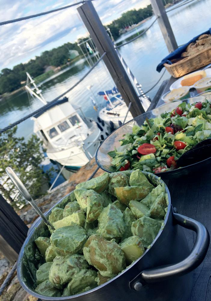 Senare samlades vi på Högholmens fina terrass för en gemensam middag. Klubben bjöd på potatissallad, grönsallad, bröd, kryddsmör mm. Deltagarna hade alla packat med egna läckerheter för grillen. Kvällen var vacker, precis som en sommarkväll i juni skall vara, kryddad med kall vind och väldigt kallt vatten.