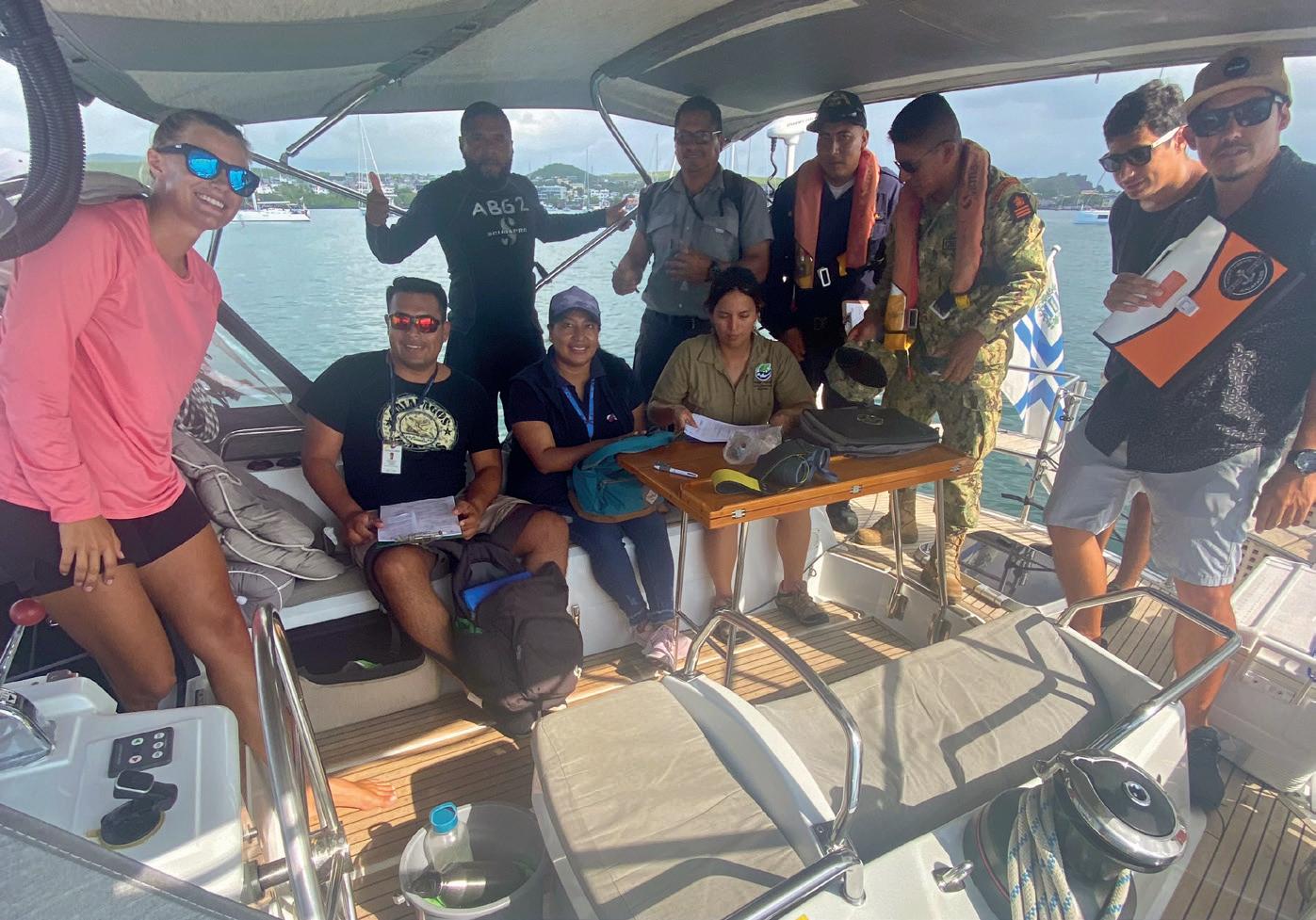 som kommer till Galapagos måste checka in vid San Cristobal. Då vi startade från Panama meddelade vi vår agent Javier från Galapagos Yacht Agents, vår ungefärliga ankomsttid samt 48 timmar före och vid ankomst. Han förmedlade informationen till alla myndigheter som bekräftade att dom kommer ombord följande morgon. Vi hade fått en lång lista på krav och utrustning av agenten så vi tog fram allting på kvällen för att ha det färdigt följande morgon. Bra var det, för det blev ganska trångt ombord på Sipi då 11 glada tjänstemän dök upp. Det var polis, tull och immigration, armé, sjöbevakning, biosäkerhetsmyndigheten, läkare, två personer från turistbyrån, två dykare och en representant för agenten.