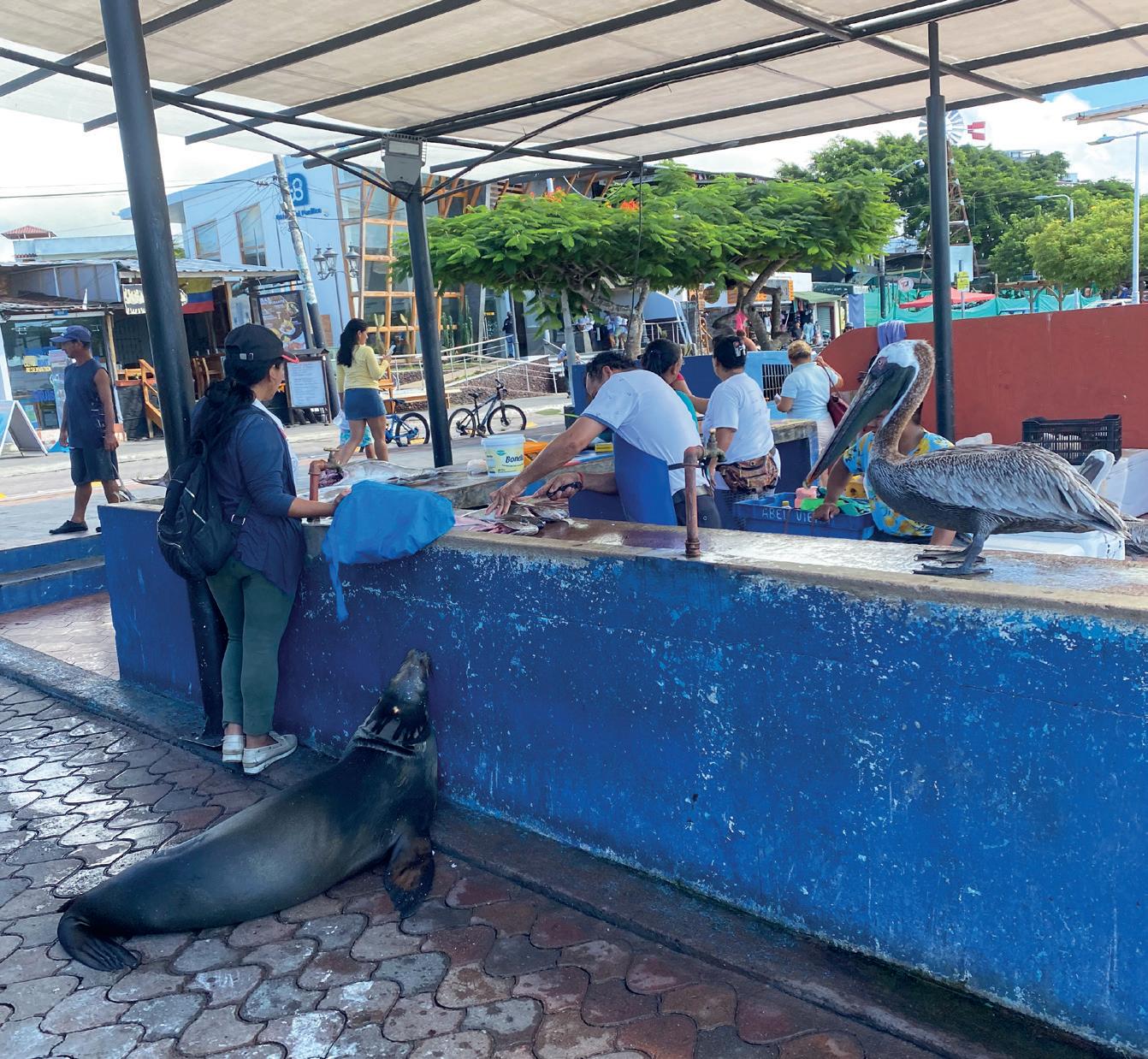 MED PASSEN STÄMPLADE och båten godkänd kunde vi äntligen ta oss i land. På de två största öarna finns det ingen småbåtsbrygga på grund av den stora sjölejon populationen. Man måste bokstavligen kliva över sjölejon och mariniguaner för att komma iland eller korsa gatan. Sjölejonen gillar också att hoppa upp i dinghyn för att sova och leka. Ibland välter de omkull jollen. Eftersom det inte finns någon brygga, och man inte kan lämna jollen i vattnet, måste man ta en taxibåt in till kajen. Om aktern på segelbåten är sådan att ett sjölejon kan ta sig upp gör man bäst i att bygga någon form av barrikad.