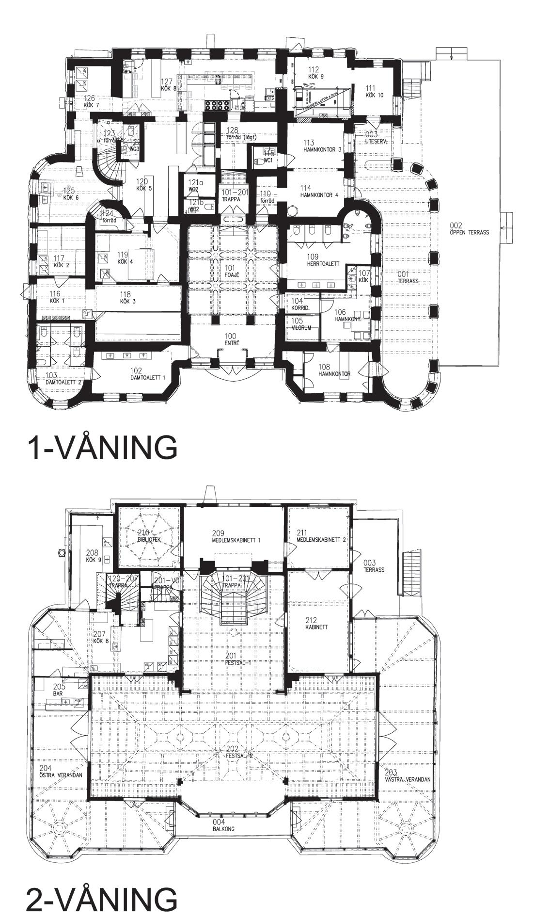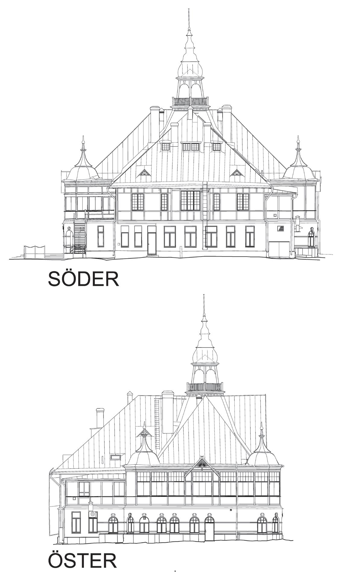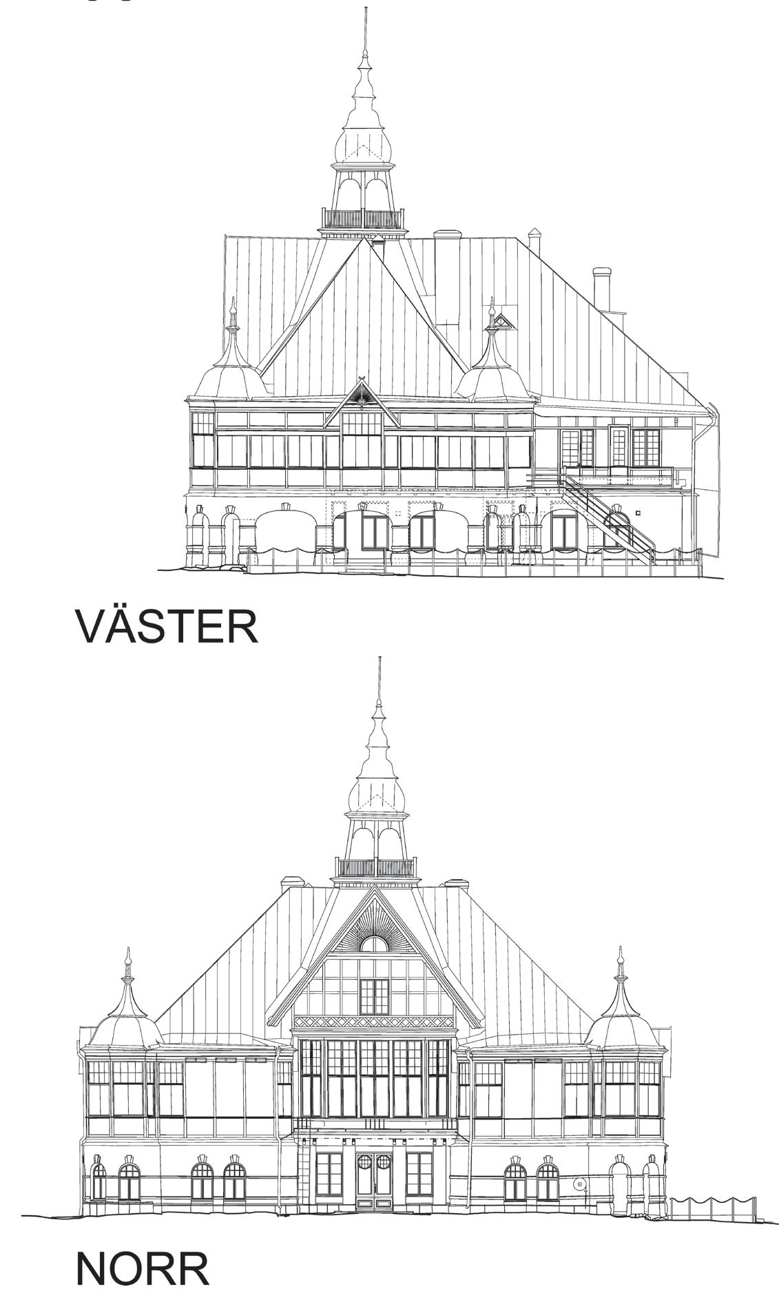(punktmolnet) framställdes råritningar, som sedan bearbetades vidare på min byrå till kompletta arkitektritningar: planritningar för första våningen, andra våningen och vinden, fasadritningar mot norr, väster, söder och öster samt fyra sektioner. I en av sektionerna finns till och med salens dekorativa tak inritat, så att detaljerna kan återskapas