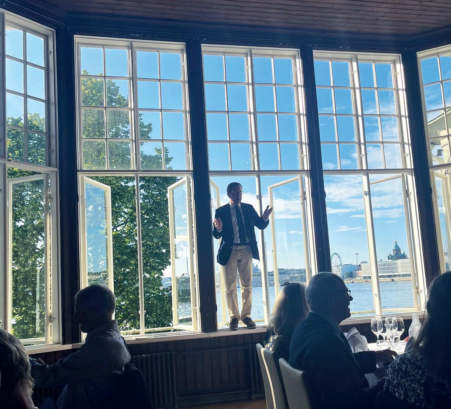 våra danska gäster. Icke att förglömma Caspers välkomsttal som han höll stående i fönsteröppningen med Helsingfors hamnprofil i fonden. Hans skutt upp till det öppna fönstret väckte först förfäran och sedan glada skratt.