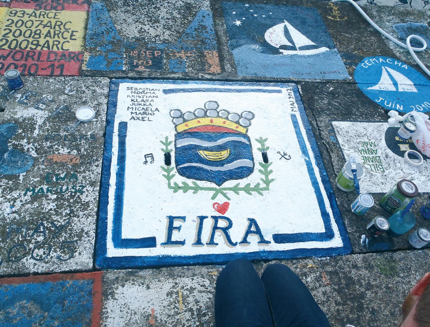 Traditionen bjuder att alla båtar som korsat oceanen bör måla sin signatur på piren på "Atlantseglarkajen" innan man kastar loss på nytt. Då kommer man att återvända till Horta, Azorerna - ergo man får en trygg seglats. Målningen är gjord av Axel Nyman och yachtens namn är EIRA, en Swan 51:a som kom från St. Maarten och fortsatte till Falmouth. Skeppare var Sebastian Gylling och överfarten gjordes i maj-juni 2012.