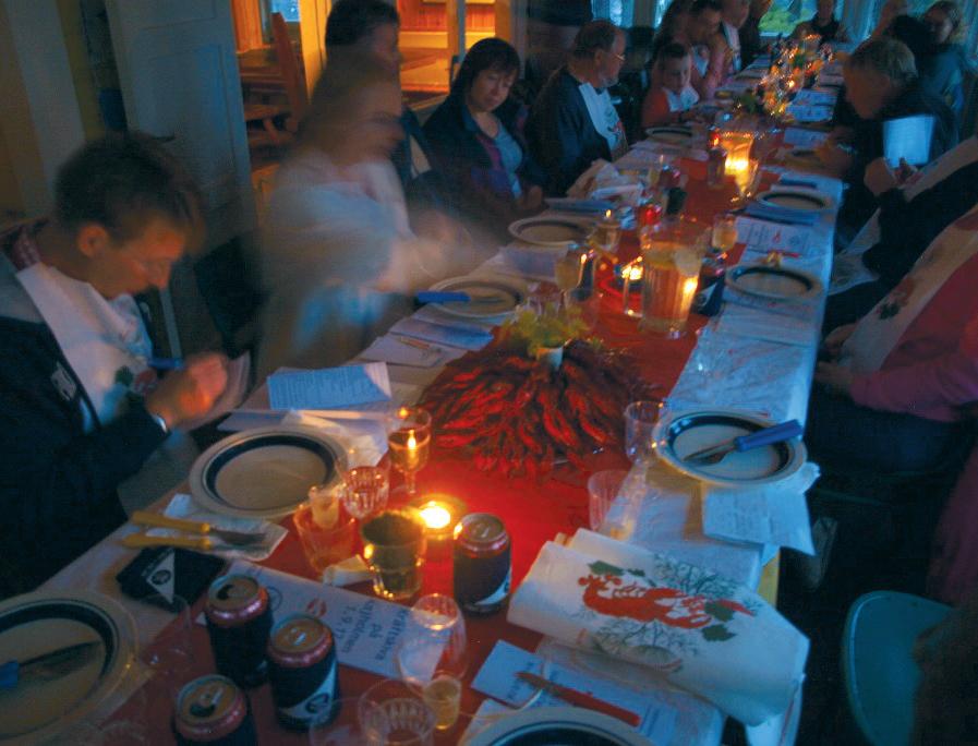 Kräftskivan kickades igång med välkomstskål och en lättsam lagtävling. Tennisbollar skulle prickas in i korgar och stickor försiktigt plockas från en hög utan att den rasade. Samtidigt skulle alla fyra lagen skriva en egen snapsvisa kvällen till ära. Efter uppvärmningarna och då alla hade hittat sin plats vid bordet serverades grillad oxfilé med grönsallad till förrätt. När den utsökt grillade filén var uppäten var det dags för kräftorna att göra entré. De var många och röda och klubbkommitténs egen Kräftsaft en-