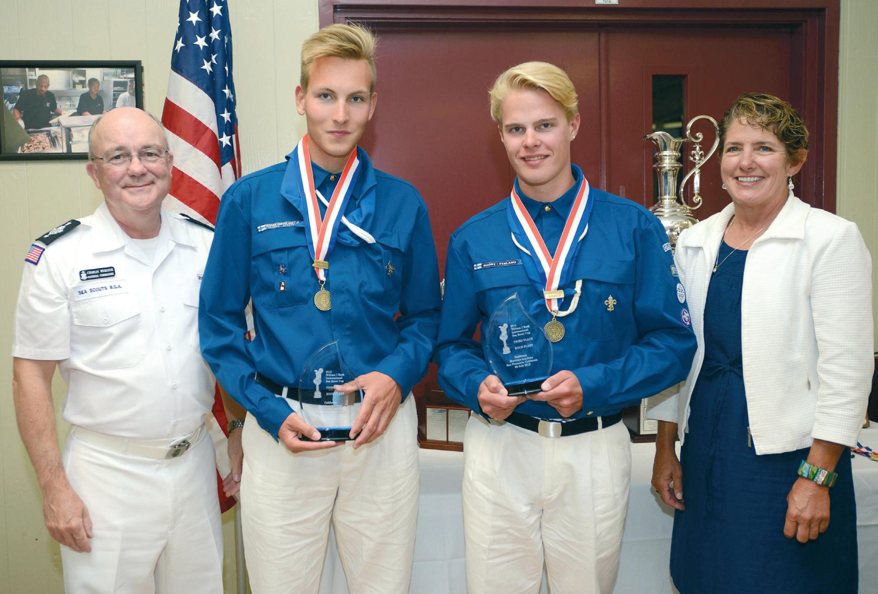 Till vänster Charles D. Wurster, Kommodor för sjöscoutavdelningen i Boy Scouts America. Till höger Charlie Arms, California Maritime Sailing Director och medlem i Jury kommittén.