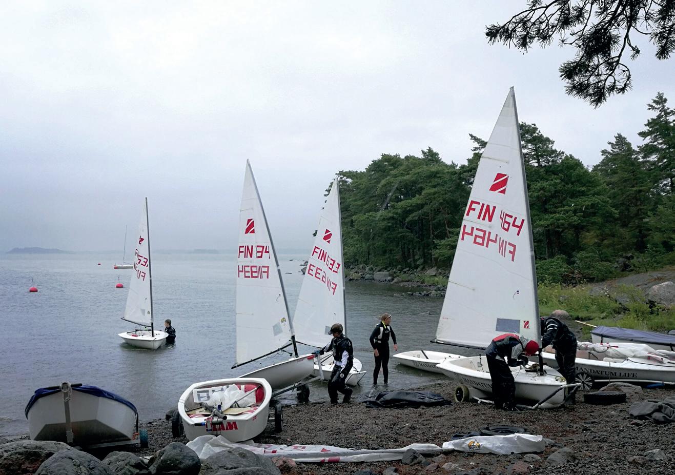 Det blåser 8 m/s jämnt, i byarna litet mer. Mörka moln ruvar över fastlandet, men solen skiner över havet. Jag lyfter riggen på min Laser och skuffar båten i sjön från vår rätt grunda strand. Efter att ha vadat 10 meter kan jag sänka fenorna och hoppa ombord. Min son Eric har gjort det samma med sin Laser precis innan.