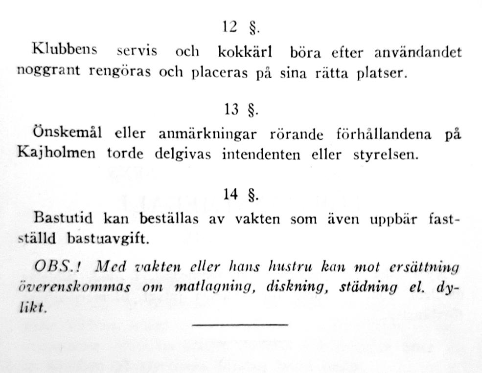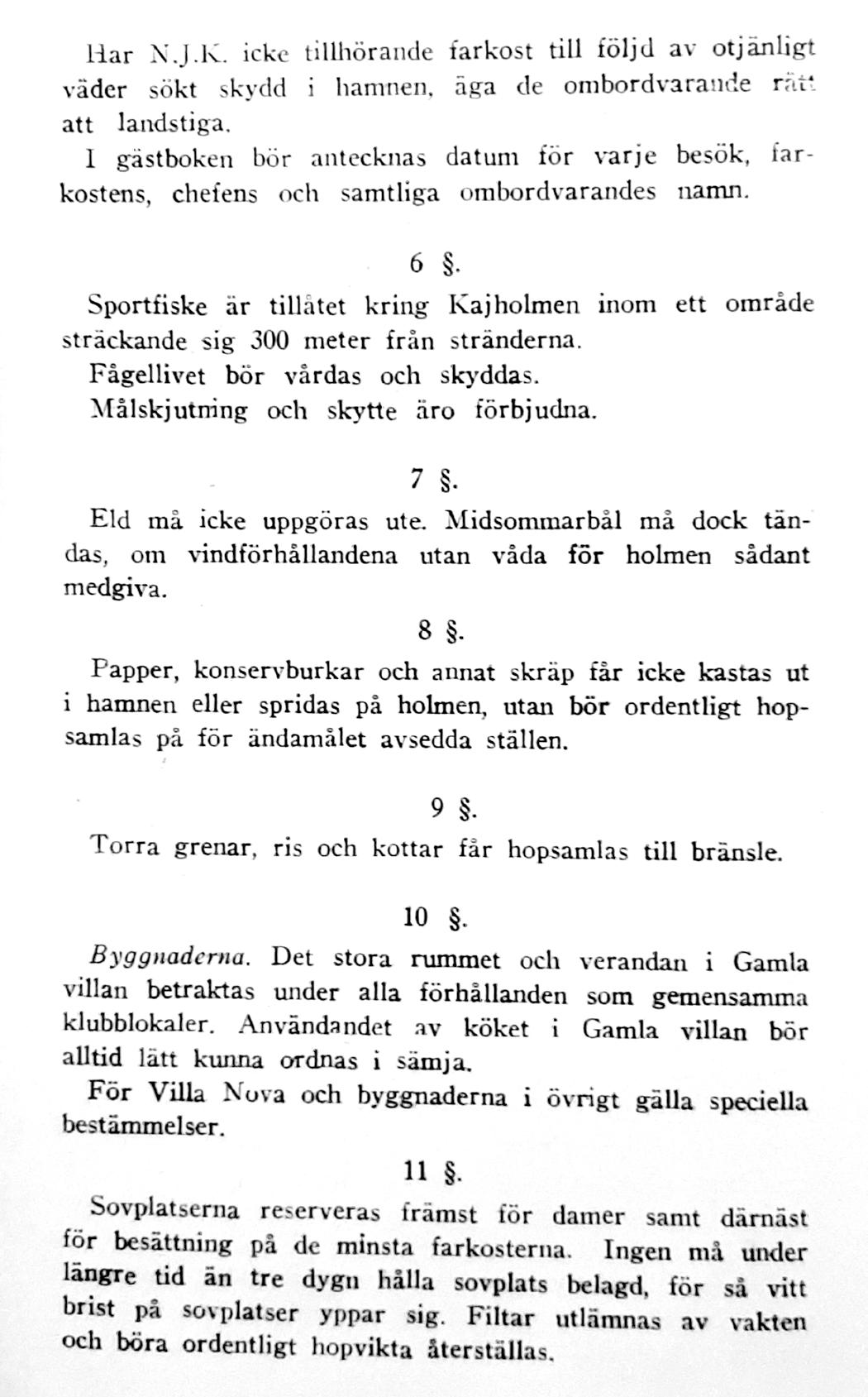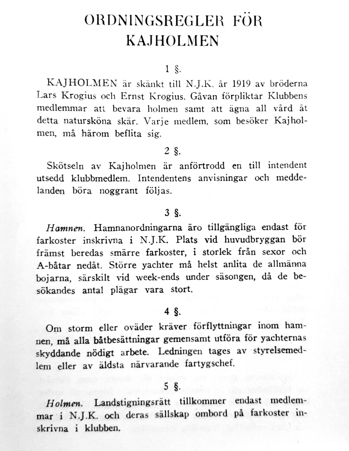 En del av kulturen på Kajholmen kan utläsas av reglerna från olika tider. Äldre regler fokuserar på medlemmarnas verksamhet medan yngre regler förankras i en utvecklad allemansrätt. Synen på naturen har gått i en ekologisk riktning. Här kan vi läsa ordningsreglerna för Kajholmen i NJK:s handbok från år 1952. Och vårt troll har koll på det mesta.