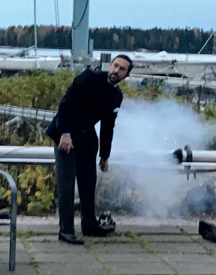 Solen är på nedan, klockan slår 17.44. Casper Grönblom bränner av det första skottet med kanonen. Jag inleder flagghalningen. Det gäller att inte hala för fort, så han hinner ladda om och avfyra det andra skottet då flaggan är halad. Min äldre son Eric, som för närvarande gör sin värnplikt på Sveaborg och precis fått permission, står i flottans stiliga uniform och tar emot klubbflaggan.