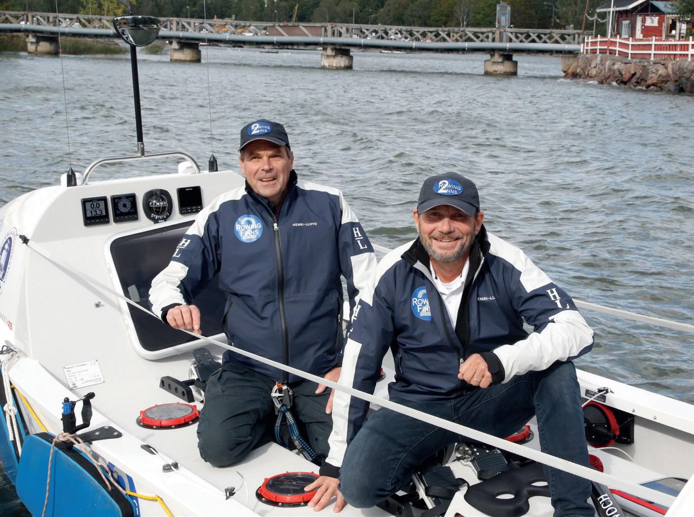 Jolle Blässar och Markus Mustelin i sin 7,3 m långa och 700 kg tunga tvårummade roddbåt.