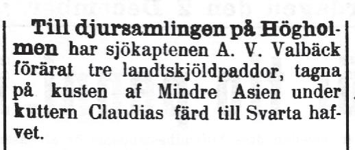 Medan Claudia väntade på resetillstånd passade kaptenerna Höglund och Valbäck att göra ”En afstickare i Mindre Asien” – en forskningstur! Från vår utflykt återvände vi ombord, medförande, förutom åtskilliga nya intryck, en mängd sköldpaddor vi fångat i några lerpölar vid stranden.