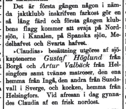 Med jämna mellanrum tar jag fram och bläddrar i festskriften Nyländska jaktklubben 1861–1961 av Tor Smedslund. Här finns mycket intressant. Senast studerade jag ”Minnesvärt från år till år” och blev nyfiken på noteringen från 1893: Claudia seglade under NJK:s flagga från Finland runt Europa till Nikolajeffsk vid Svarta havet. När vi tidigare i höst lyssnade på Antero Järvinens intressanta föredrag om seglatsen ”Runt Rovaniemi” insåg vi att den seglatsen inte kunde bli av i nuvarande världsläge, lika lite kunde vi föreställa oss en seglats till Svarta havet just nu. Men nu ser jag tillbaka i tiden och med hjälp av dagspressen i de digitala samlingarna (digi.kansalliskirjasto.fi) kan vi få en uppfattning om hur det gick till för 130 år sedan.
