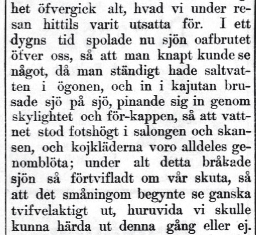 Från första ögonblicket märkte vi, att det var en ypperlig seglare vi hade under oss… den svåra sjögången ökades så att vattnet yrde över hela skutan. Tillika inträffade nu missödet att klon på storgaffeln sprang i tre bitar, till följd hvaraf vi blevo tvungna att bärga storseglet och reparera skadan.