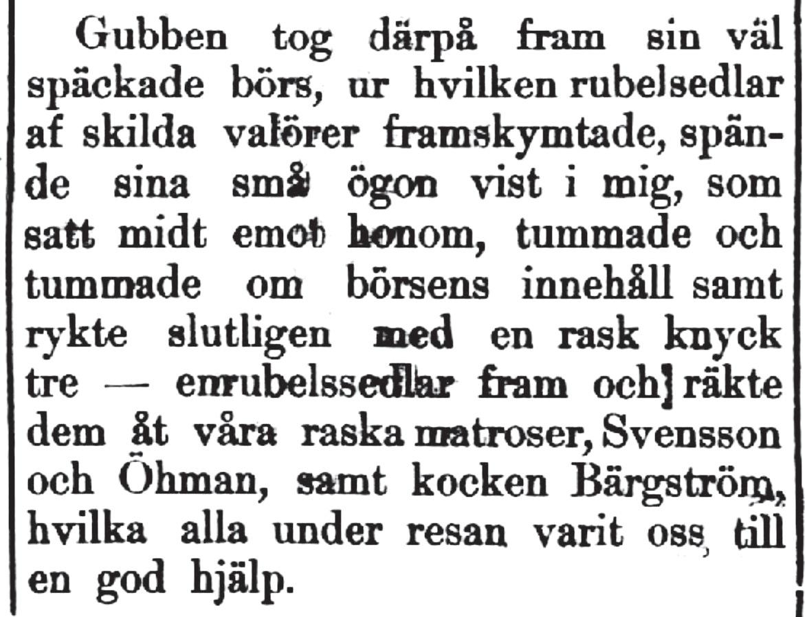När nu öboarne såg vår skuta med främmande skrof och rigg, sträfva upp mot deras landningsställe, skyndade de, ”man ur huset” ner till stranden; men vi, varsnande den manliga befolkningens lurviga, banditliknande apparition, läto tanken på landgång fara och vände vår farkost åter ut till hafs, antagligen till stor missräkning för folket på ön.