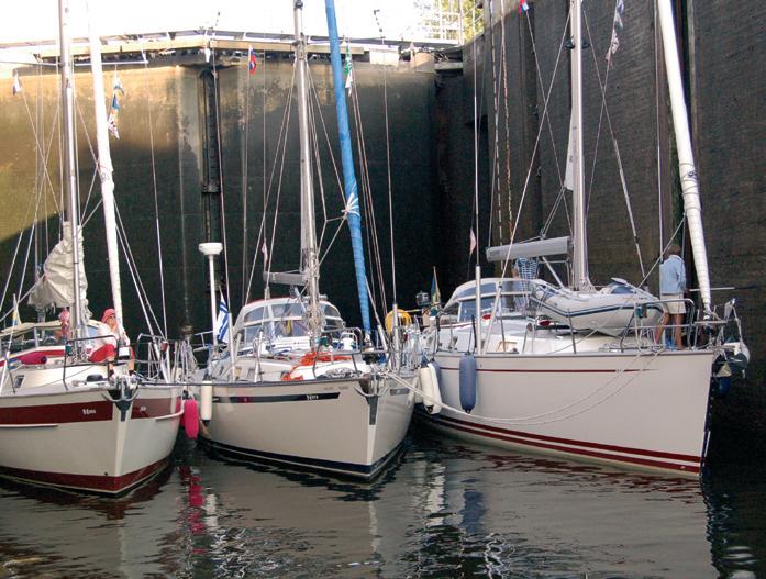 båtar i slussen på en gång, men antingen var båtarna för stora eller slussen för liten för slussandet gick inte helt enligt planerna i början. Snabbt lärde vi oss den rätta ordningen på båtarna och slussandet gick som smort.