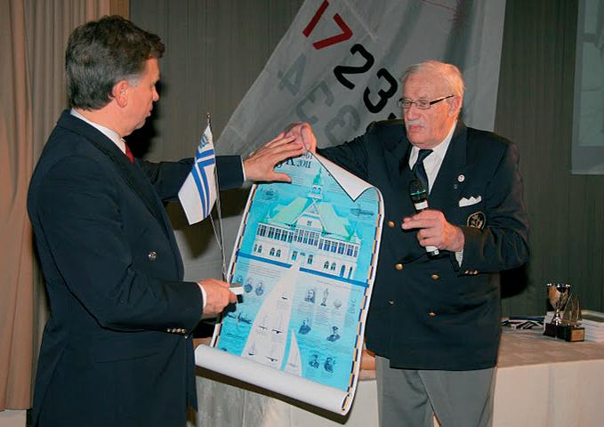 Cirka 500 Pärnubor uppklädda till tänderna, damerna i allt från det kortkortaste jag sett till balklänningar, herrar i seglarparad med o utan kravatt eller fluga och jeans satt vid runda bord o inmundigade Viru Valge, skumpa o diverse förrättsbetonade maträtter. Efter en tyst minut för nyligen avlidne Rauno Alatalo (HSK) hedersmedlem i klubben spelade orkestern 150 decibels popmusik och tal följde på tal samt prisutdelning till de seniorer o juniorer som utmärkt sig i klubbens, samt i nationella och internationella tävlingar. Jag blev uppvaktad med en kort presentation samt tilldelad klubbens märke och ett diplom. I mitt svarstal framförde jag Gunillas hälsning, överräckte standerten och scrollen till kommodor Egon. Sen följde dans o skumpa osv. Jag drog mej dock tidigt tillbaka då jag ännu skulle köra till Tallinn för första morgonbåten till Hesa.