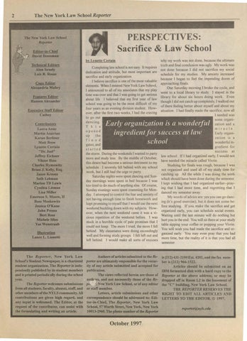 Completing law school is not easy. It requires dedication and attitude, but most important are sacrifice and early organization. I believe sacrifice is one of the most valuable elements. When I entered New York Law School, I announced to all of my associates that my play time was over and that I was going to get serious about life. I believed that" my first year of law school was going to be the most difficult of my four years as an evening division student. However, after the first two weeks, I had the craving to go out dancing. T h i s opened i11gr~die11tfor up the f Io o d gates, and started the storm. During the weekends I wanted to party more and study less. By the middle of October, this desire had become a serious detriment to my schedule. I severely fell behind with my school work, but I still had the urge to party. Saturday nights were spent dancing and Sunday mornings were spent in bed because I was too tired to do much of anything else. Of course, Sunday evenings were spent cramming for Monday. I attemped to control the fear and anxiety of not having enough time to finish homework and kept promising to myself that I would use the next weekend buckling down with my subjects. However, when the next weekend came it was a vicious repetition of the weekend before. I was stuck in a horrible cycle of pale promises that I could not keep. The more I tried, the more I fell behind. My classmates were doing exceedingly well and forming study groups. I felt left out and left behind. I would make all sorts of excuses
