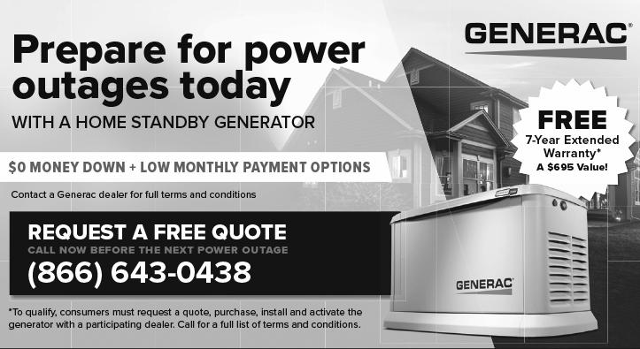Prepare for power outages today with a GENERAC home standby generator $0 Down + Low Monthly Pmt Request a free Quote. Call before the next power outage: 1-855-948-6176