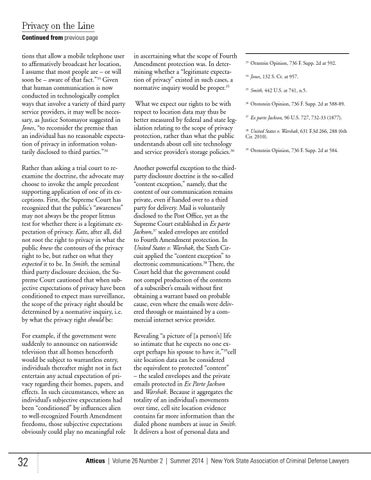 Privacy on the Line Continued from previous page tions that allow a mobile telephone user to affirmatively broadcast her location, I assume that most people are – or will soon be – aware of that fact.”33 Given that human communication is now conducted in technologically complex ways that involve a variety of third party service providers, it may well be necessary, as Justice Sotomayor suggested in Jones, “to reconsider the premise than an individual has no reasonable expectation of privacy in information voluntarily disclosed to third parties.”34