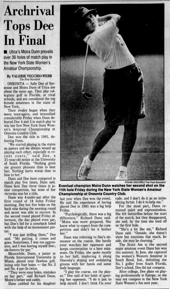 Her first Oak Hill Cup bid in 1992 came against a familiar rival, Sally Dee of Syracuse. The two had faced off five times in match play previously, the most recent having been Dee’s championship victory over Dunn-Bohls at the NYS Women’s Am a year prior in 1991. The pair were unquestionably the two best female amateurs in New York State at the time.