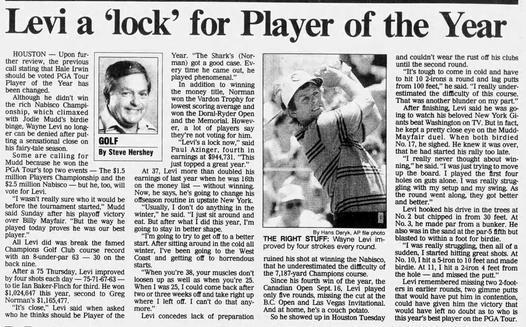 The peak of Levi’s career came in 1990, a season in which he won four PGA Tour events — the BellSouth Classic, Centel Western Open, Canon Greater Hartford Open, and Canadian Open — and was honored as PGA Tour Player of the Year