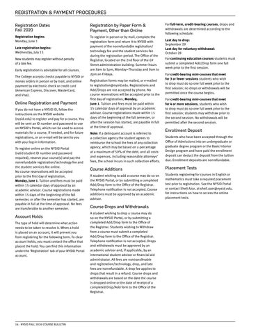 Online Registration and Payment If you do not have a NYSID ID, follow the instructions on the NYSID website (nysid.edu) to register and pay for a course. You will be sent an ID number and password to use on NYSID’s Portal, which can be used to access materials for a course, if needed, and for future registrations, or an e-mail will be sent to you with your log-in information. To register online on the NYSID Portal (valid student ID number and password required), reserve your course(s) and pay the nonrefundable registration/technology fee and the student services fee online. No course reservations will be accepted prior to the first day of registration, Monday, June 1. Tuition and fees must be paid within 15 calendar days of approval by an academic advisor. Course registrations made within 15 days of the beginning of the fall semester, or after the semester has started, are payable in full at the time of approval. No fees are transferable to another semester.