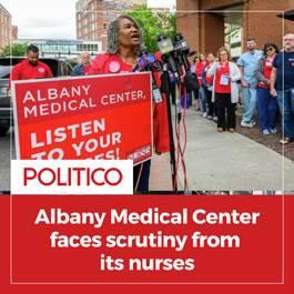 publicly share a so-called “final offer.” The press conference — and subsequent PR blitz and pressure campaign — was yet another attempt on the hospital’s part to avoid accountability, silence outspoken nurse advocates, and pressure nurses into accepting a contract that won’t solve the staffing and quality care crisis at the hospital. Instead of bargaining in good faith with nurses and trying to create meaningful solutions to the staffing crisis, the hospital has spent untold thousands of dollars and countless hours using cynical public relations tactics to hide this truth from the public: Albany Med cares more about their profits than it does about nurses and patients.