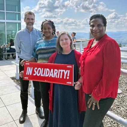 President Nancy Hagans, BSN, RN, CCRN; First Vice President Judith Cutchin, DNP, RN; and Treasurer Margaret Franks, BSN, RN, MEDSURG-BC, attended AI and the Future of Work, an international conference at the Cornell School of Labor Studies, representing National Nurses United (NNU).