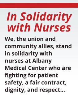 Despite the hospital’s best efforts, NYSNA nurses at Albany Med refuse to be bullied. Nurses know that this latest offer doesn’t do nearly enough to guarantee the safe staffing, fair wages and benefits, and union voice that they need to provide safe, quality patient care for the capital region. They are heading back to the bargaining table, and they won’t accept a contract that compromises on patient care when their friends’, families’, community members’, and fellow New Yorkers’ lives are at stake. NYSNA nurses know that when we fight, we win — and Albany Med nurses won’t stop fighting until they win the fair contract for all Albany Med nurses and patients. If you’re a nurse in upstate New York, you can support Albany Med nurses by signing their petition and sharing a story about the impact Albany Med’s staffing crisis has on your patients or facility at https:// nysna.salsalabs.org/albanymedceo