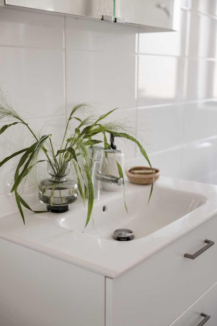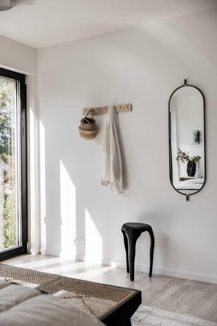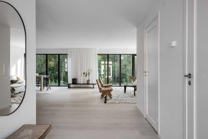 Ni välkomnas in i bostaden och slås direkt av välvalda materialval och stilrena ytskikt. Klinkergolv tillsammans med vitmålade väggar