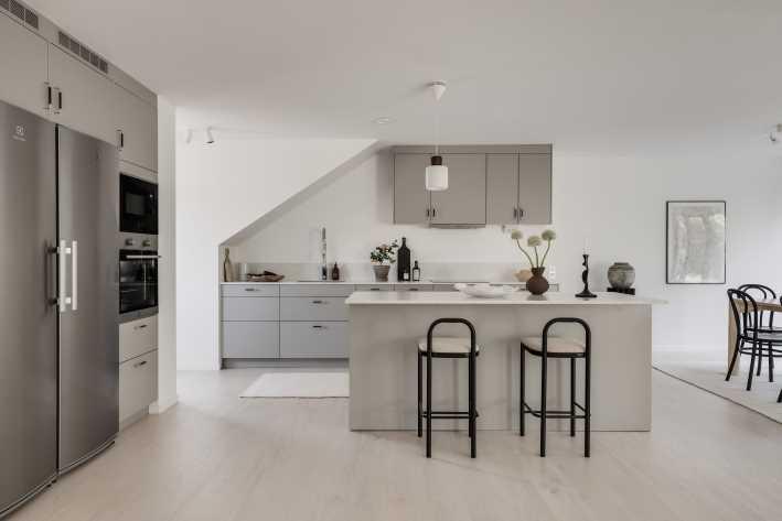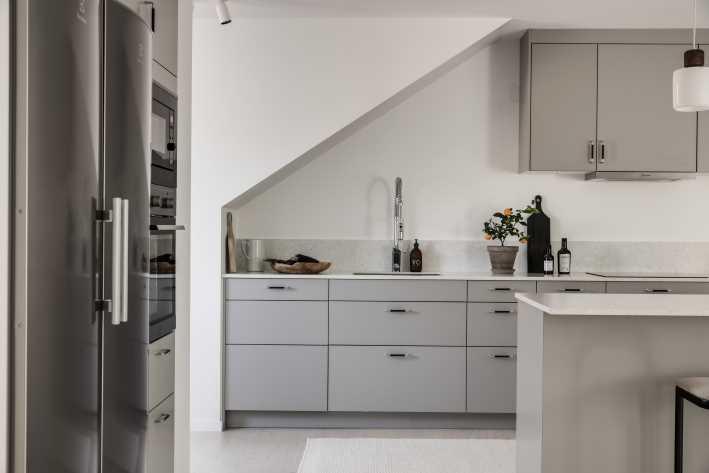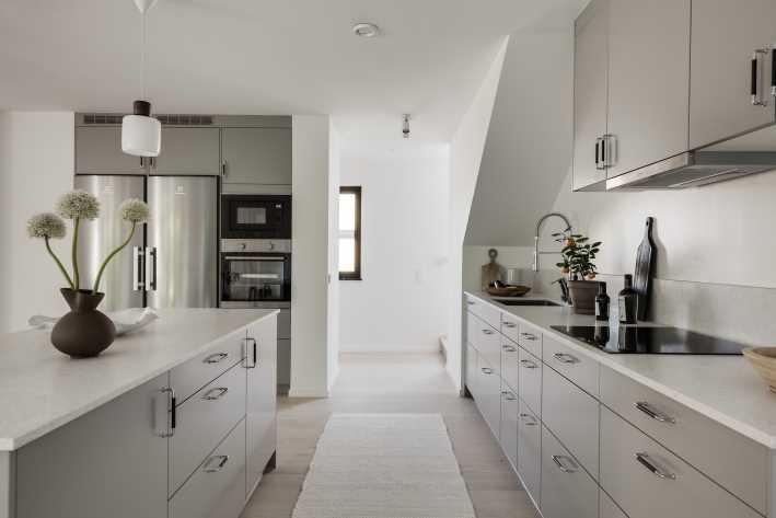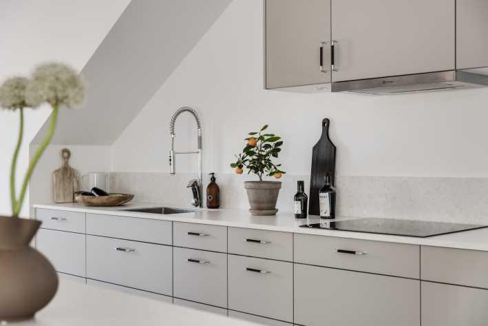 Toppmodernt kök från Ballingslöv med skåpsluckor i grå nyans. Den maskinella utrustningen består av induktionshäll, inbyggd diskmaskin, varmluftsugn och micro samt kyl och frys i fullhöjd Här erbjuds gott om arbetsyta samt förvaringsmöjligheter. I detta kök är det lätt att hitta inspiration till goda middagar
