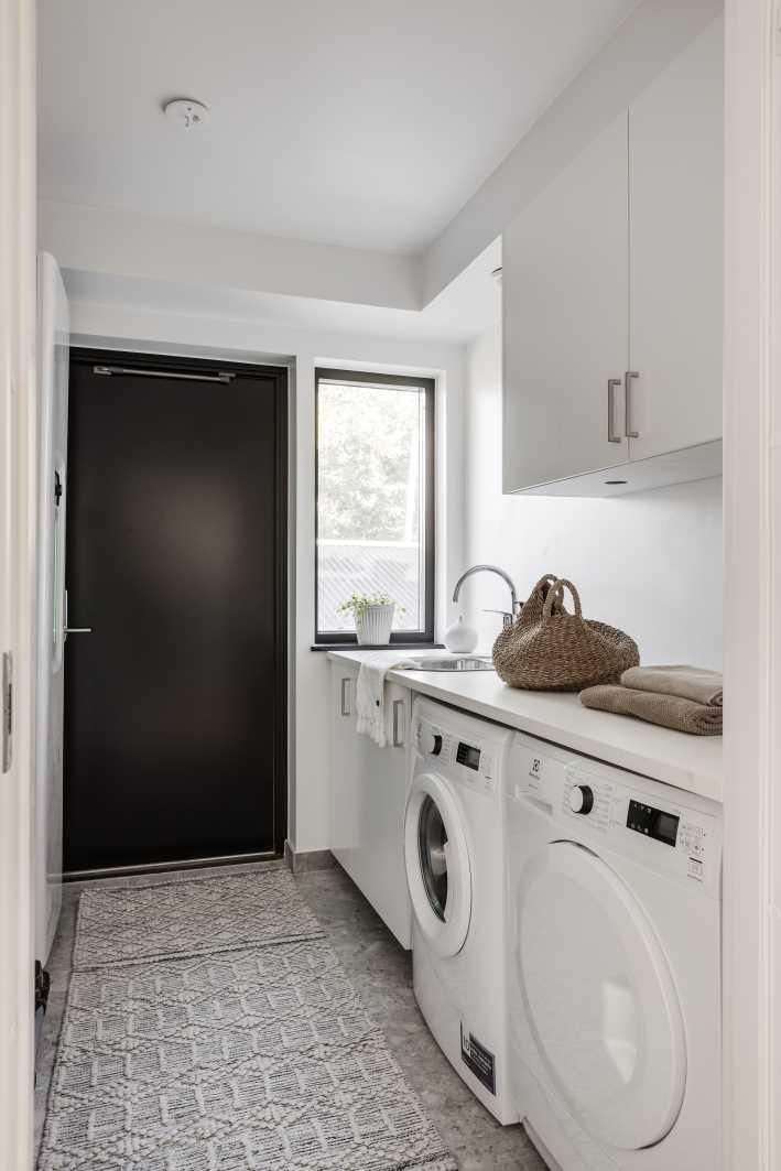 Tvättstugan har gott om förvaring med såväl bänkskåp som överskåp Praktisk arbetsbänk i sten med rostfri diskbänk Utrymmet har tvättmaskin, torktummlare och torkskåp.