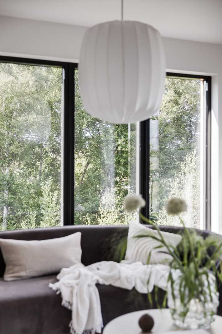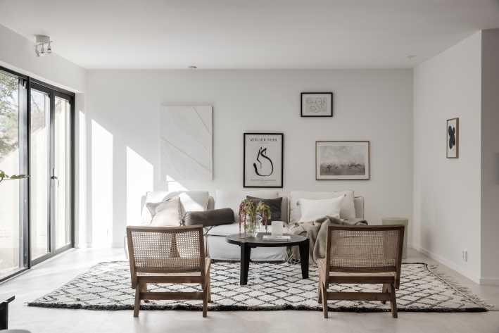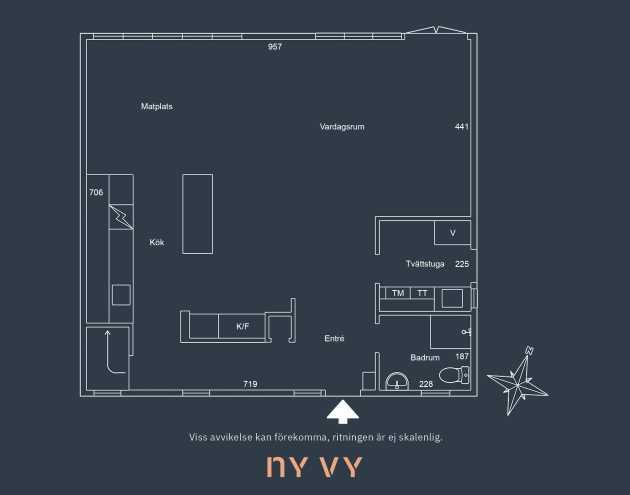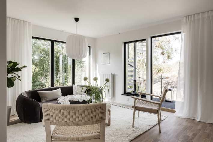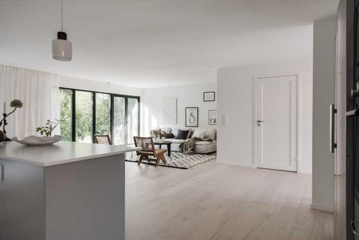 Vidare in i bostaden finner ni kök och vardagsrum i en öppen och social planlösning med stora fönsterpartier som tillåter ljuset att flöda och bidrar tillsammans med den höga takhöjden en luftig atmosfär Här har ni möjlighet att möblera utifrån egen smak och tycke Ljusa väggar tillsammans med parkettgolv.