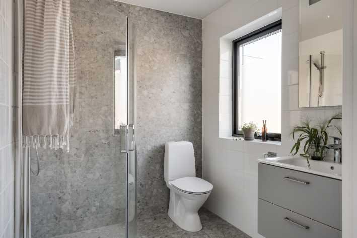 Bostadens andra badrum är likt det första med vitt kakel på väggarna tillsammans med grått klinkergolv Utrustat med wc, handfatskommod med ovansittande spegel med belysning samt duschhörna.