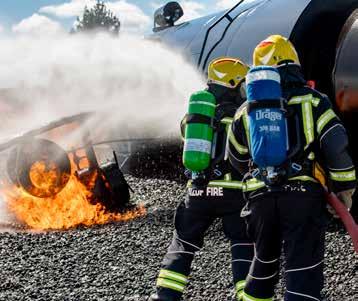 The students saw a simulated hot fire using pressurised fuel on a purposebuilt aircraft, and watched as crews approached the fire and doused flames using high-pressure hoses and fire suppressant sprayed from the monitor on top of an Aviation Rescue Fire Fighting Vehicle (ARFFV).