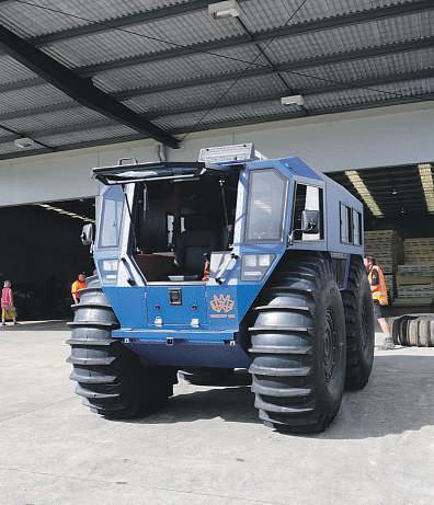 more than 20 years of development and will handle steep hills, jagged rocks or dense forests with remarkable manoeuvrability and 600mm of ground clearance. It comes with 4 interior options - cargo only, or 2, 4 or 7 passenger seats while the exterior is made from galvanised steel and is corrosion resistant. With additional fuel tanks in each wheel disk the SHERP N 1200 has a total fuel capacity of 327 litres allowing it to operate for up to 65 hours and it can run for 19 hours non stop. It has a towing capacity of 2350kg and the load capability can be increased to 1950kg by adding the optional cargo trailer (as pictured).